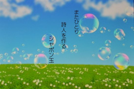 孫たちが遊びに来ると「シャボン玉したい!」と言い、庭でよくシャボン玉をする。そのうちに親たちも真剣な顔立ちでシャボン玉をし始める…。親たちの方が楽しんでいるようだ。それを見て楽しんでいる爺がいる。シャボン玉はなんと無心な人間を創り出すあそびなのであろうか。