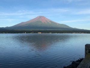 昨日の朝は晴れ!五時に起きて山中湖畔へ。富士山にタンクをお披露目したかったのだが、右の写真の様に朝日に映えた富士が赤富士状態!湖面の逆さ富士とともに感激の景色に出会うことが出来た。学生たちは夏合宿の最中、湖畔の道を走る若者たちに元気を貰う朝でした。さあ、ネジを巻いて川柳の宿題をやっつけねば。