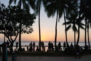 ハワイの夕日はいつ見ても綺麗だ!曇り空のことはほとんどなくいつも晴れている。しかし少しだけ薄雲があった方がいい、茜雲が秀逸だから…。夕日時にはみんな浜辺に出てサンセットを楽しんでいる。夕日に向かってイルカのように泳いでいく少年たちも。ハワイにはこんな夕日の写真を撮りたくて