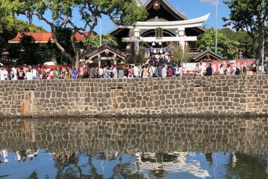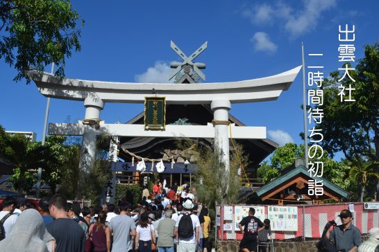 ハワイでの元旦、レアレアトロリーの路線図上に「出雲大社」を見つけていたので初詣に行ってみることにした。朝のビュッフェでウエイターさんに「出雲大社に行かれたことありますか?」と尋ねると、「毎年行っているよ、でも元旦は地元の人も観光客も行くから二時間以上待つよ。行くなら明日の方がいいよ。」と教えてくれた。が、午前中は特に予定がなかったので家内と行ってみることにした。