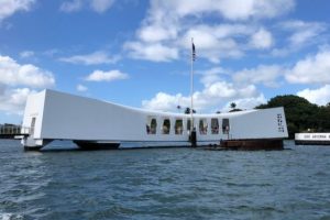 ると思う。下の写真は「アリゾナ記念館」、日本軍の奇襲作戦で撃沈された戦艦アリゾナが海底に眠っている。そこで亡くなられた1000名余りの名前がこの海上の記念館に記載されている。