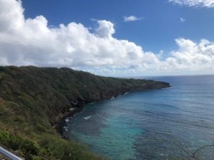 る。2階建てバス「ダブルデッカー」を利用して、オアフ島東海岸の美しい海岸線をドライブ!途中、カハラモールに立ち寄り、ココヘッドパーク、ハナウマ湾展望台、サンディビーチ、ハロナ潮吹き穴、シーライフパークまでご案内しますという。嬉しいことにガイド付きで観光地では15分ほど停車してくれる。