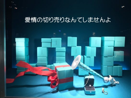 るだけなのだ。左のアップルのショップもエレガントだし、上の写真のような楽しい飾りつけのショウウインドウもある。箱ひとつでも売れたら「LOVE」が崩れてしまいそうなのだが…。まあ、愛情はそんなに簡単に切り売りされたらたまりませんけどね。