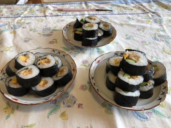 お昼はバアバの指導で巻き寿司に挑戦。ところが具のキュウリはあまり好きでないと言う。ということで自分の分はキュウリ抜き!パパやママにもお土産用を作り、ジイジとバアバの夕食も巻き寿司に。宿題をした後は、三人でビンゴやトランプで遊ぶ。
