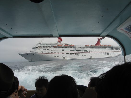 平成21年の「アメリカ西海岸クルーズ」の続きです。ロスのロングビーチを出港し、次の朝には太平洋上のサンタカタリナ島に着いていました。船は沖合に停泊し、テンダーボートで上陸です。右の写真は、港に向かうテンダーボートからクルーズ船をパチリ。サンタカタリナ島をネットで調べると、