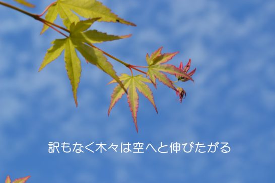 久し振りのこのシリーズです。200人の作家さんが参加されたこの企画、今でも気長に掲載句と遊んでいるのは私だけかもしれません。写真を付けたり英訳したり、貧乏性なのでしょう。でも楽しく遊んでおります。よい陽気になった春、庭の木々は思いっきり枝を伸ばし始めています。「訳もなく」なんてことはありません、訳はあるのです…。我が家の子供たちも自由に空へ伸びていったなあとある種の感慨を覚えます。訳など知る必要もないでしょう、それなりに元気でやっていますから…。