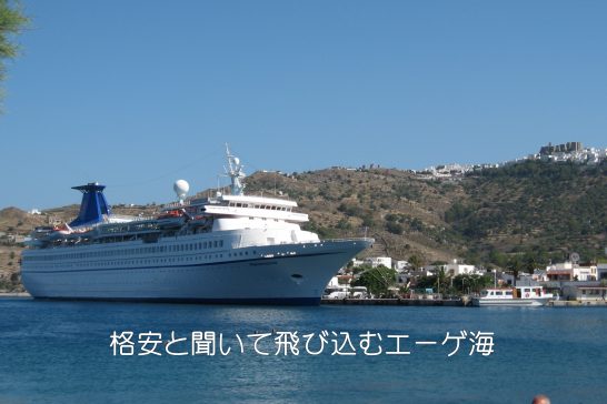 平成23年の「エーゲ海クルーズの旅」です。前年、格安と聞いて初めてのクルーズ旅に参加してみましたが、クルーズの定番「エーゲ海も時期を選べば安い」と聞いてツアーに参加しました。七泊八日で14人ほどのツアーでしたが、アテネ→ミコノス島→クシャダス(トルコ)→パトモス島→ロードス島→クレタ島→サントリーニ島→アテネと、地中海は天候も良く、波穏やかで島巡り、名所巡りを楽しみました。地中海の空と海の青にクルーズ船アクアマリンがよく映えます。ちょうど南アフリカWカップが開催されていて、船上のモ