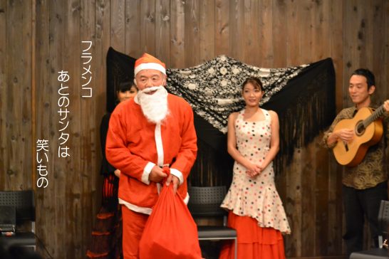 2回目は5,6年前だろうか、ある仲間内の会でフラメンコショウを開いたことがあった。集まったのは30人ほどで子供は10人ほど。ちょうどクリスマスの頃で、多分自分から「サンタになる」と言い出したと思う。素晴らしいショウのあとでサンタ姿で登場し集まった子供たちにプレゼントを渡したのだ! プレゼントなら自分の方が欲しいくせに...。優しいギタリストのお兄さんがプレゼントを渡す時曲を奏でてくれた。