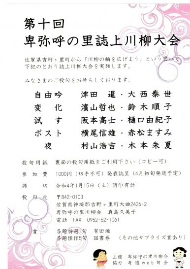 卑弥呼の里誌上川柳大会のご紹介です! 例年この時期になるとこの大会の投句に悩まされます。もうとっくに投句された方も多いと思いますが、私はこの大会のハイグレードさに怖気ずくのです。今回も没を覚悟で投句するしかありません。