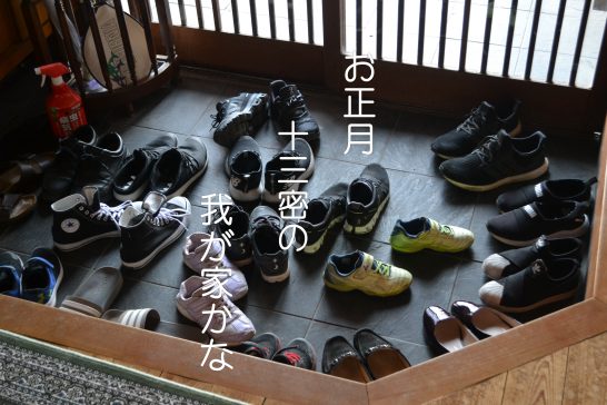 今年のお正月は久しぶりに一族が勢ぞろい!長男家族(3人)、長女家族(4人)、次男家族(4人)にジイジとバアバを合わせて総勢13人! 玄関はご覧の通りの状態でした。でも今年はスキーに出かける家族はいないので、まだ玄関には余裕があります。ニューイア―駅伝の交通規制を避けて終盤戦の頃に初詣へ。初詣は長女家族、次男家族と。いつもは鳥居の外まで行列があるのに、今年はほとんど待つことなくお参りをすることができました。おみくじは「小吉」、ま