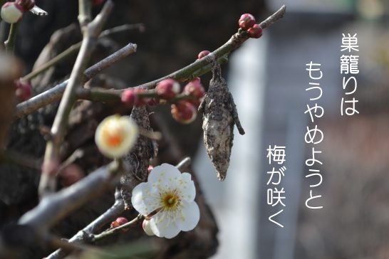 今年も庭の梅の老木が花を付けている。ご老木でそろそろ枯れそうな木なのだが、好きな梅酒を作る上でも切り倒すわけにはいかない。そんな梅の老木に「みのむし」がぶらさがっていた。このみのむしもずっと巣籠をしていたのだろう。梅の花が「もう春だから巣籠なんてよしませんか?」と言っているようだ。コロナの感染者は思ったほど減ってこないが、そろそろ「with CORONA」の過ごし方を考えねばと思う。