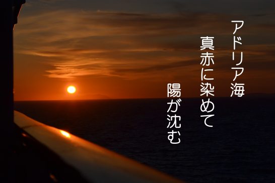 平成25年の「東地中海クルーズ」の続きです。朝日や夕陽の写真を撮るのが好きで、旅先でもチャンスがあれば撮るようにしています。海の上では朝日も夕陽も障害物がありませんのでバッチリです!早起きするのは辛いので、夕陽の写真を撮ることが多いのですが、クルーズではちょうど予め決められた夕食の時間に重なります。アドリア海の夕陽、この写真が残っていたということは夕食の時間にうまく重ならなかったのでしょう…。クルーズ船のデッキの手すりに夕陽が映り込み満足な写真が撮れました。サンセットのこの時間頃からクルーズ船では「ショウタイム」が始ま