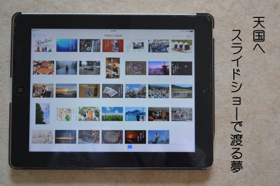 これまでこのブログに700句余りのフォト川柳を紹介させて頂いた。趣味の写真と川柳を合体させてみたのだが、作り溜めたフォト川柳は1127句になる。いい句ができればそれに合う写真を見つけたくなるし、いい写真が撮れればそれに合う句を詠みたくなる。始めた頃は100ほども出来れば冊子にでもして終りだなと思っていたがもうこんなに増えてしまえば冊子にするのは諦めた。お気に入りのフォト川柳(現在のところ665句)はiPadに転送してスライドショーでひとりで眺めている。上の写真はファイルに収められている写真(スライド)だが「スライドショー」をクリックすると各スライドが大写しになる。スライド1枚が7秒ほどだから全部を見終わるには1時間以上かかるのだが、10数枚見た頃には寝入っているようだ。夜中に目が覚めた時もスライドショーは継続中である…。今の願いは天国へ旅立つ時にこのスライドショーを見ながら行きたいと思うのである。いろいろな想い出を振り返りながら…。今のところ家内も子供たちもこのフォト川柳のファイルの