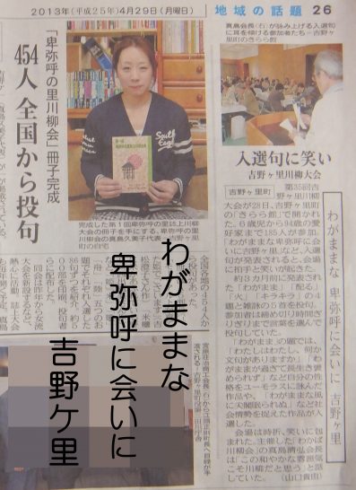 ケ里川柳大会は日本で一番の家族的な大会だと思います。参加賞は「湯がいた筍!」会員の皆さんが掘って湯がいた筍を前日に行って袋詰めするのが私の役目でした。清弘さん手製の竹細工も賞品でした。お昼もお弁当にお味噌汁、筍料理など感動ものでした。再開されたらみなさん是非一度お出かけ下さい。私も頑張って出かけようと思っています。「わがままな卑弥呼」は卑弥呼の里誌上川柳大会を熱心に続けていらっしゃいます、こちらの方も今後ともよろしくご支援下さい。