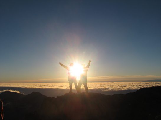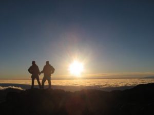 天の星を観察した後でのサンライズ、我々夫婦を崖淵に立たせそれはそれは恐いポーズをとらされました。でもそれも良い記念写真になりました。朝の太陽が年老いた二人の間にある写真などもう撮りようもありませんから…。