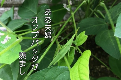 そんな枝豆の葉陰にオンブバッタが!!大きい方がメスで背中に乗っているのがオスらしい…。傍から見ても実に仲よさそうなバッタである。羨ましい限り…。数は少ないから枝豆の葉を食い荒らすようなことはない。菜園にはいろんな小動物が住んでいるが、そんな姿を見ているのも楽しいものだ。蜥蜴もいますよ!!