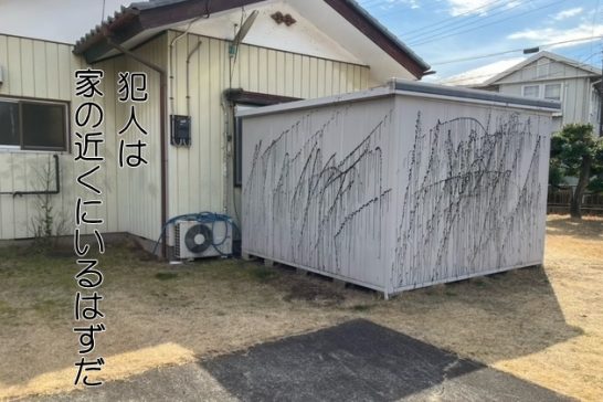群馬県は車を所有している家が多く、たいがいは2台持っている。我が家も2台あるのだが駐車スペースも2台分。子供たちが来たり、お客さんがある時用にと近所のTさんの所有地に駐車スペースを借りている。先日お客さんがあり、愛車を留め、翌々日に車を取りに行ったら、車に黒い塗料がべったり塗られていた!!驚いて家に帰り洗車を試みたら、幸いなことに水性の墨だったらしく綺麗に蘇った。比較的大きな団地だが、こんな話はこれまで聞いたことがない。写真は借りている駐車スペースと側にある物置小屋。小屋にはべったり墨が塗られたままになっている。誰がこんなことをしたのだろう?多分酔っ払いだろうけど迷惑な話だ。わざわざこんな所まで悪戯をしに来る人はいないだろうから近所のおじさんなのかもしれない…。愛車も洗う前に証拠写真を撮っておくべきだったと悔やんでいる。