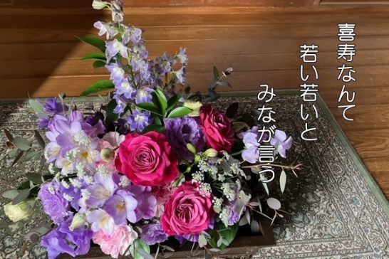 私事ですが、この12日に喜寿を迎えました。遠方の長女と次男は来れませんでしたが、長男家族が祝ってくれました。子供たちから写真の花束と財布と靴とケーキ(77の数字のローソク)を頂いた!幸せ者です
