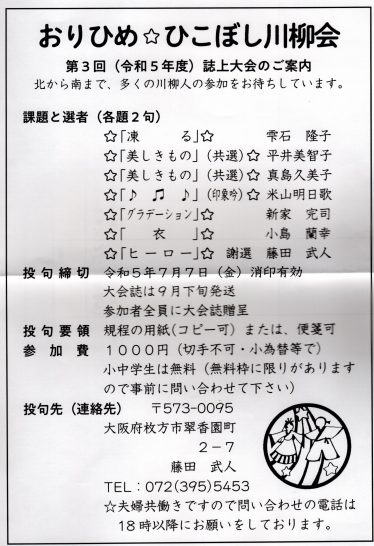 作品集には「おりひめ・ひこぼし川柳会」の誌上大会の案内が同封されていた。ご夫婦で運営されている会だが、多数のみなさんの参加をお願いします!!