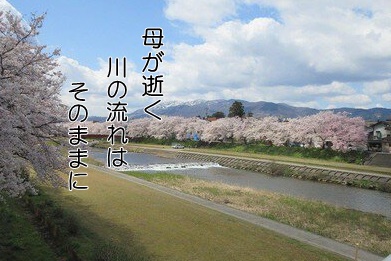 母が亡くなった翌朝、実家の前の小矢部川を歩いていて浮かんできた句である。葬儀の際に紹介してしまった。どなたも訳が分からなかったことだろう。川べりには桜並木があるが、春祭りの頃には満開の桜が楽しめた。