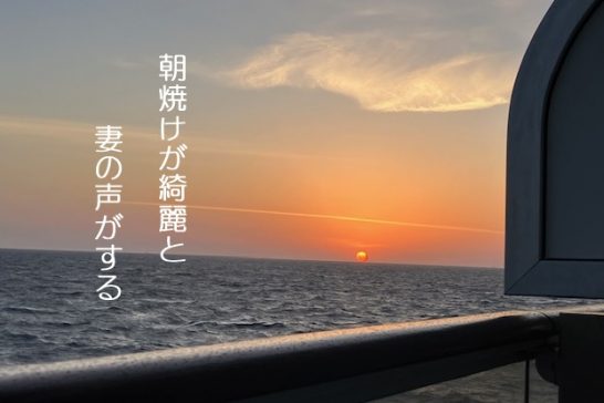 旅に出るとその土地のサンライズやサンセットを撮るのを楽しみにしている。これまではいつも一眼レフカメラを担いで回っていたが、スマホのカメラでも充分いい写真が撮れると知ってからスマホに依存している。クルーズ中のある日、寝ていたらベランダの家内から「見て見て朝焼けが綺麗よ!」との声が…。ということでベランダに出てパチリ。サンセットも撮りたかったのだが、あいにくディナーの時間に重なりチャンスを逃してしまった。食い気優先という情けなさであった。