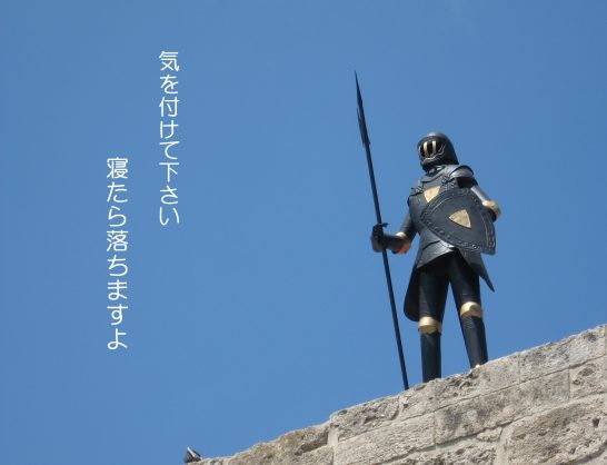 平成22年のエーゲ海クルーズで訪れたロドス島、城壁の上に騎士団の兵士が甲冑姿で立っていました。しっかりと固定してあるのでしょうが、落ちそうで...。ロドス島の騎士団の館の内部も拝見できましたが、このころは膝が悪く、歩くのが辛く、早々に船に戻った思い出があります。