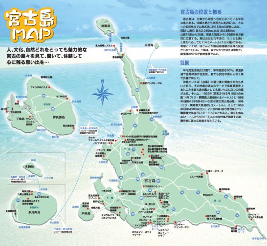 「集落は、港がある島の南側に集中する。集落から丘を登ると遠見台があり、宮古島、池間島を展望できる。集落以外の島内の多くは聖域とされ、島民以外の(場合によっては島民も)立ち入りが禁じられている。秘祭・祖神祭(ウヤガン)が開催されることで知られ
