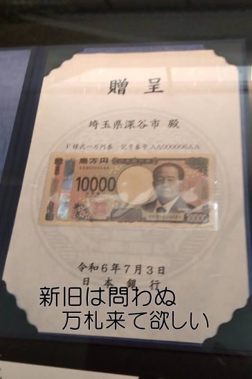 先日埼玉県深谷市の柳人から新一万円札の写真が届いた。深谷市役所に展示されている若い番号の貴重な一万円札である。渋沢栄一のゆかりの市としては2番を希望されていたようだが、6番が届いたらしい。深谷市は新札発行に盛り上がっている。7月14日(日)には祝賀パレードも行われるとのこと、ネットでは、
