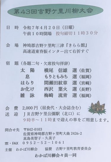 吉野ケ里川柳大会は日本で一番家庭的な大会だと確信している。平成12年頃から行き始めてほとんど毎年参加していた。お土産の「茹で筍」や昼食の手作りの煮ものも魅力だが何と言っても雑詠の選の梅崎流青さんの披講に魅力を感じていた。そんな縁で流青さんが主宰されている葦群にも入らさせて頂いたが、葦群の川柳のレベルにはなかなか追いついていない。今年の大会は4月20日、九州近郊にお住まいの方は是非ご参加下さい。