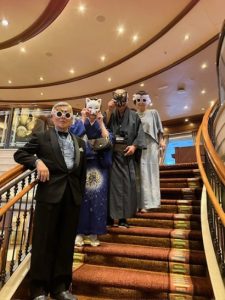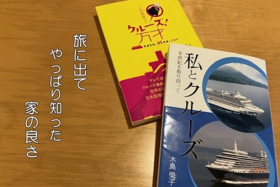 借りたクルーズに関する上の写真の2冊は日本におけるクルーズ旅の歴史を知る上で参考になりました。乗客は英語圏の方が7割、日本人2割、キルギスの方もいらっしゃいました。ショーを見ていた時お隣のオーストラリアのご夫婦に声を掛けられメルアドを交換しました。このご夫婦とは何度も顔を合わせ何かの縁を感じました。このご夫婦にシャッターを押していただいた我々4人組のガラディナーの写真です。しかし豪華客船といっても部屋は狭いし、湯船もない。日本のテレビは見れないしネットも通信料が高くて使えない。夫婦でケンカをしても別居できない…。家に帰ってたっぷりのお湯に浸かり、ああ家はいいなあと身に染みて感じているのであります。