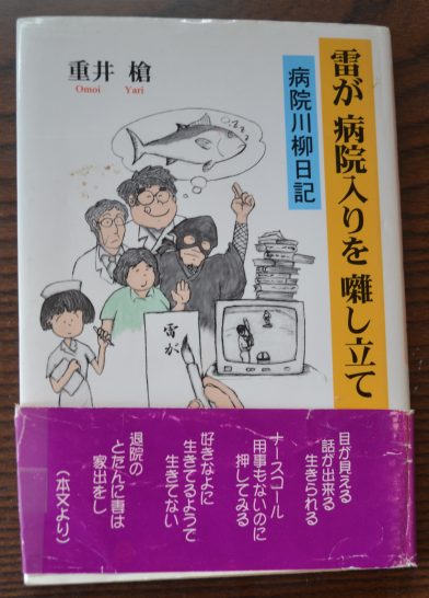 やり」、この題で直ぐに思いついたのが「重井槍」。それで上の写真の句を出してしまった。「重井槍」は平成11年に出版した私の最初の句集「雷が病院入りを囃し立て」(新葉館出版ではありません)(写真右)のペンネームなのであります。まだサラリーマン川柳しか知らない時のど素人の句ばかり、それを「おもいやり」を捩ったペンネームにしたものだから家族の顰蹙をかってしまった。特に家内からはキツイ言葉が返ってきた。しかしこの句集のおかげでそれからの川柳への道が開けたのだから「重井槍」も捨てたものではない。