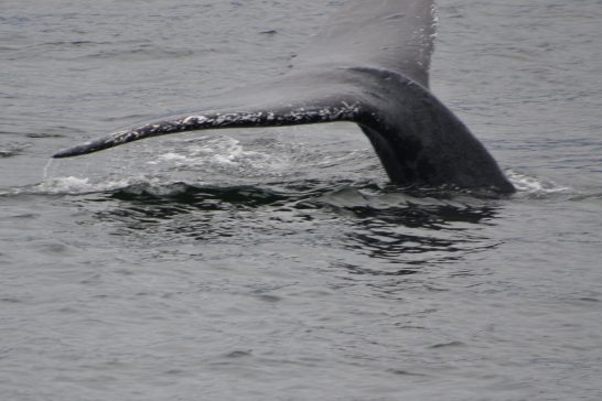 うにクジラが乱舞しています!船の客全員がカメラで追いかけるのですが、海の上に姿を現すのは一瞬のことです。上の写真はツアー仲間のWさんに頂いたものです。素人はなかなかこのような写真は撮れません。ちなみに私の最上のショットは右のようなものでした。時期にもよりますがクジラを見たいならアラスカ沖がベストでしょう!氷河の山々やアラスカの森に囲まれてクジラを見れるのは至福の時だと思います。