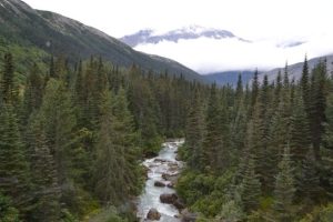 カナダ国境のホワイトパスまで900mを駆け上ります。絶景でした!山合いを流れる川にはサケの大群が遡上、針葉樹林帯や氷河の山並はいかにもアラスカを感じさせるものでした。カナダとの国境を越えましたが、パスポートの提示は必要ありませんでした。ツアー仲間とお喋りしながらのんびりの鉄道旅もいいものでした。