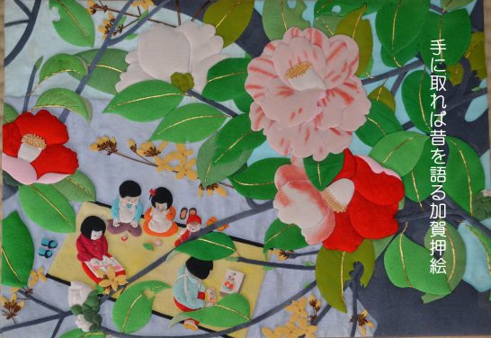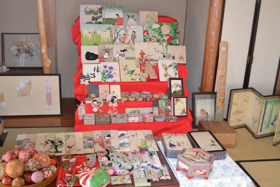 金沢に住んだ家内の祖母が趣味で作っていた「加賀押絵」、縮緬の端切れに真綿を入れたもので屏風、掛け軸、小箱、短冊、絵画などを作った作品だ。祖母は沢山作ったらしいが、欲しいという人に気軽に渡していたそうで、残っている作品は100点ほど。一人娘の家内が受け継ぎ、後世に残そうと保管している。以前は雛飾りを終えた雛壇に並べ虫干しをしていた。今は小さい娘もいないので雛壇だけを出し、虫干しをしている。
