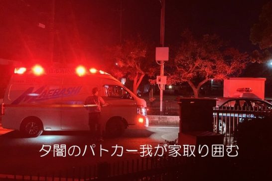 11日の夕方のこと、プレバトを見ていたらパトカーのサイレンの音。どんどん近づいて来て家の前で止まった。それも一台ではない、救急車もいる。何事かと外に出て咄嗟に撮ったのが上の写真。普段は灯りが落ちている東隣りの家にこうこうと灯りがついてる。この家の独り暮らしのKさんとは一度も話したことがないし、Kさんが誰かと話しているのを見たこともない。毎日公園の水道をジャブジャブと使っている不思議な人だった。民生委員の方が警察官と話しているのを盗み聞きすると、何日も洗濯物が取り込まれていないので不思議に思った近所の方が民生委員の方に連絡したらしい。Kさんが家の中で倒れていらっしゃったみたいだ。事件性の有無を調べているらしい。私は一度外に出たきりだが、家内は何度も情報を取りに外へ出る。結局亡くなっていらしたようだ。この家は今後どうなることだろう。同年配の方だが身につまされる思いをした。
