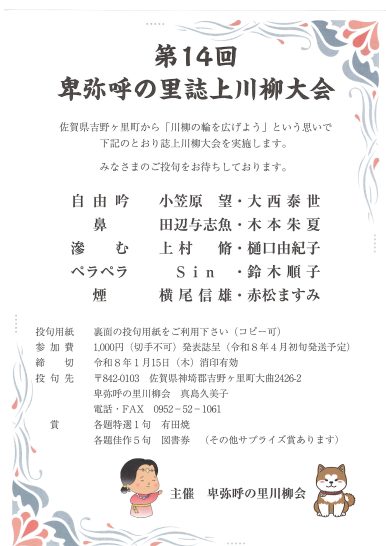 卑弥呼の里川柳誌上大会の締め切りが一ヶ月を切りました。未投句の方はご準備下さい。小百合さんよりお若い美人(よいしょ)の卑弥呼さんがお待ちです!