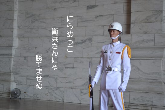 動かない人間、その1.台湾の中正紀念堂(蒋介石元総統の記念堂)の衛兵さん。ヨーロッパのお城の衛兵さんもそうだが、ピクリともしない。にらめっこ!当然勝てません!交代式の時間になると観光客がどっと押し寄せ、カメラのフラッシュを浴びています。じっとしてるのは職業とはいえ、辛いと思いますがねえ...。時々「にこっ」と笑ったり、ウインクでもすると人気者の衛兵さんになれると思いますがねえ。