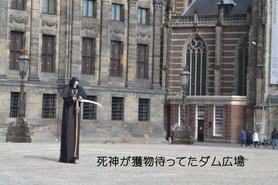 オランダ・アムステルダムのダム広場。ダム広場は、もとはアムステル川をせき止める堰(ダム)のあった場所である。「アムステルダム」の市名の語源であり、歴史的な中心地である。中心地ではあるが、添乗員さんが真っ先に「スリに注意して下さい!」と。ヨーロッパはいずこもスリが多い。そんなスリには遭わなかったが、ダム広場に大きな鎌を持った死神!ほとんど動かないのだが、それ故に不気味な存在で近寄りがたかった。