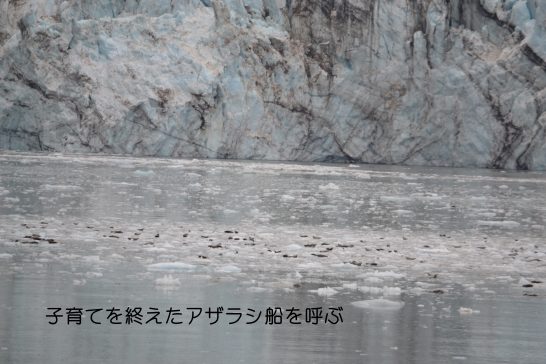アラスカクルーズのクライマックスは氷河!このクルーズではグレイシャーベイにあるジョンポプキンス氷河を見に行った。グレイシャーベイの入り口でレインジャーがボートで船に乗り込んでくる。船が動物たちに迷惑をかけないよう注意を払うためだ。幸いなことに出かけた時期はアザラシの子育てが終わり、船は氷河の手前の氷上にいるアザラシたちに近づくことが出来た。写真に黒豆のように写っているのがアザラシ...。アザラシたちの安息を邪魔しないように気をつけたのだが、一部のツアー客は氷河の崩壊の度に大歓声をあげていた。