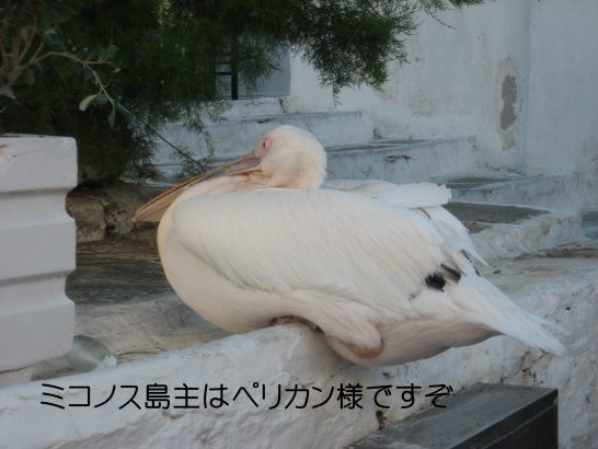 そんなミコノス島の主は「ペドロ」という名のペリカン!ペドロに会いに島を訪れる人も多いそうですが、島を訪れても会える確証はありません。この時は街角の小さな広場の人ごみの中にデンとお座りになっておりました。もう7年も前の写真ですが、ご存命でしょうか?少し心配にはなります。