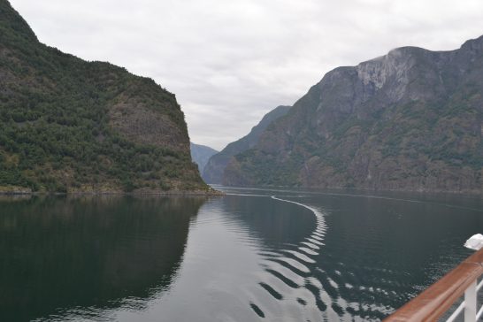 ノルウェイのフィヨルドクルーズ、両岸の絶壁に遮られた穏やかな海がある。波も無く、航行する船の軌跡がいつまでも残っている。そんな航跡を辿ってカモメが一羽(写真の右下)ついてくる。そんなどこまでも続く異空間にいるとこのままこの時が流れていくように思える。