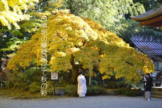 秋になると富士山に逢いたくなって撮りに行くのだが、北口本宮富士浅間神社へ行くのも楽しみのひとつである。富士山信仰の社であり、登山口にもなっている。この神社には秋になると見事に色づく大銀杏がある。先日も逢いに行ってきた。いつも参拝客は少なく、秋の彩付きをのんびり楽しめる。今回、式を終えたばかりなのか、早撮りなのか和装のカップルが大銀杏の手前のモミジで写真撮影をしていた。奥さんはなかなかの美人さんでもっぱらこちらが被写体!新婚のお二人はどんな夢を抱いているのだろうか…。気の弱い幣は正面の写真を撮る度胸も無く、後姿をパチリ…。ご主人は幼顔で、大丈夫かなと勝手に心配していた。静かな神社も参道を出る頃には中国人観光客を乗せた大型バスが到着し、参道も境内も一気に騒々しくなってしまった。