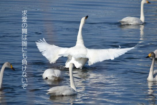 この時期になると家から車で10分ほどの烏川にコハクチョウが飛来してくる。岩倉橋の少し下流の淀みに去年は百羽ほどが来ていた。今年はまだ見に行っていないが、誰かが餌付けをしているらしく、年々数が増えているそうだ。冬場、用事で岩倉橋を通る時はいつもコハクチョウのことが気にかかる。穏やかに川面を泳いでいるだけなのだが、時おり求愛の舞なのか羽ばたいている。もう求愛など縁も無くなった幣にとってはなんとも羨ましく見ているのが関の山といったところ……。