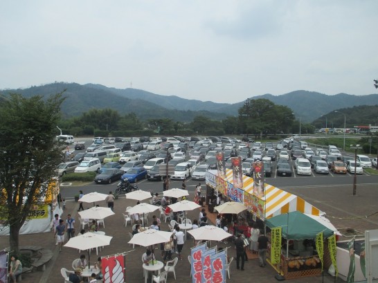写真下:正午ごろの加西サービスエリア。車がいっぱい。渋滞を抜けてホッとした皆さんが、屋台のヤキソバやタコヤキや五平餅、かき氷やソフトクリームを楽しんでいて、まるで縁日というムードだった。