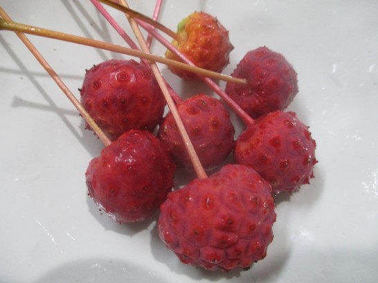 落下した実は、グニャグニャで気味が悪いので、枝に付いている赤いのがいいです。ヤマボウシは背が高いので、枝まで届きにくいですが…。