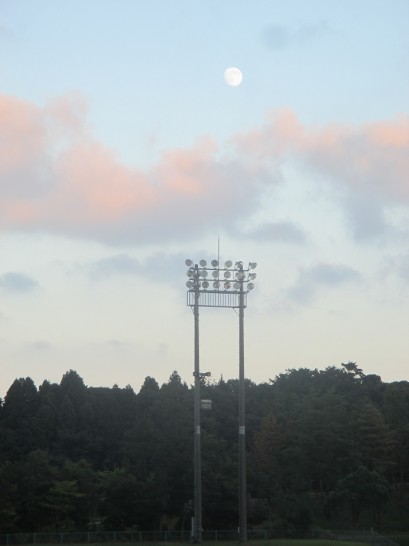 写真下: 午後5時30分帰着後、着替えて散歩。ふと気がついたら、野球場の上に昼の月。いや、もう午後6時を過ぎていたので、夕刻の月か。