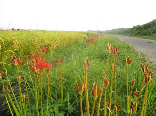 写真下: 本日夕刻の散歩にて。13日、久美子さんの彼岸花が咲いていたというコメントに対して「こちらはまだです」と返事したが、今日、畦道にいっぱい咲いていた。よく見ると半分以上がツボミなので、最近咲いたのだろう。いよいよ秋本番である。