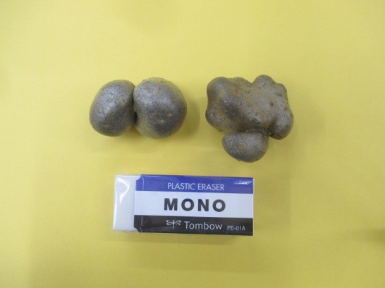 写真上: 昼前の散歩道。青空に飛行機雲が鮮やかだった。 写真下: 夕刻の散歩道。ムカゴを採りながら歩いていたら、キバナコスモス?の見事な群。祝杯のツマミにと、今シーズン初めてのムカゴを採る。いつもの散歩道沿いで、小さいのはいっぱいあったが大きいのを選んで1回分ほど。いちばん下の写真は、本日のベスト・ツー。大きさ比較は60円の消しゴム。北田のりこさんのコメント(20日のブログ)で教えていただいた通り、茹でたあと、ごま油で煎って塩パラパラ。ベリーグーだった!