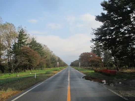 写真上: 50年前に、八郎潟を干拓して生まれた「大潟村」の1本道。縦横の道すべて、このようなまっすぐな道が続いている。