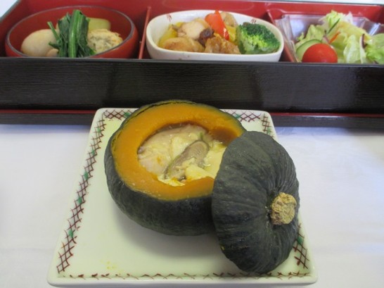 珍しくて旨かった「カボチャの茶碗蒸し」。器は小さなカボチャ。あとは普通の茶碗蒸しと同じ。蓋の下あたりが丸くえぐれているのは、スプーンで二口ほど食べてから「あっ、写真や!」と、気がついたため。